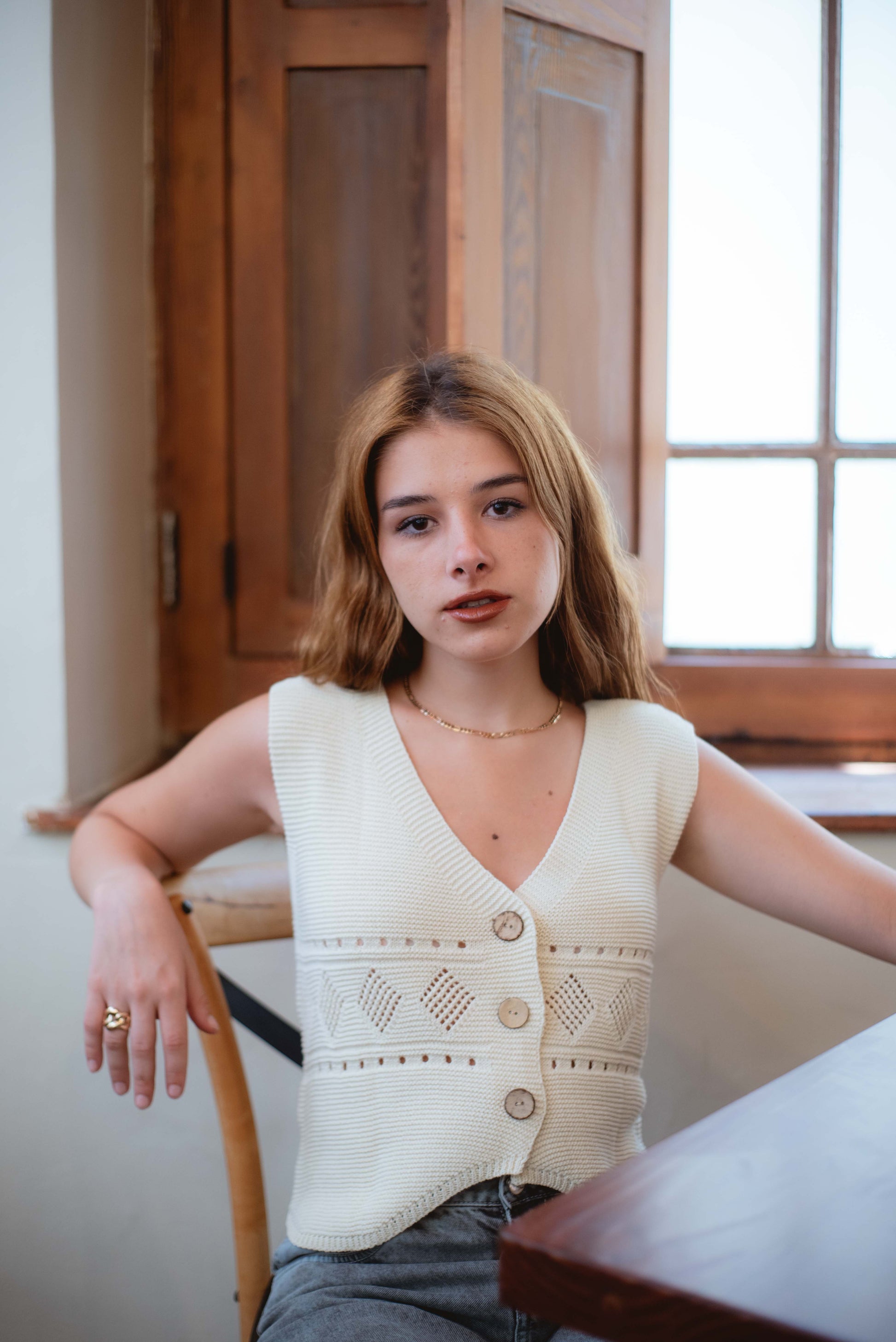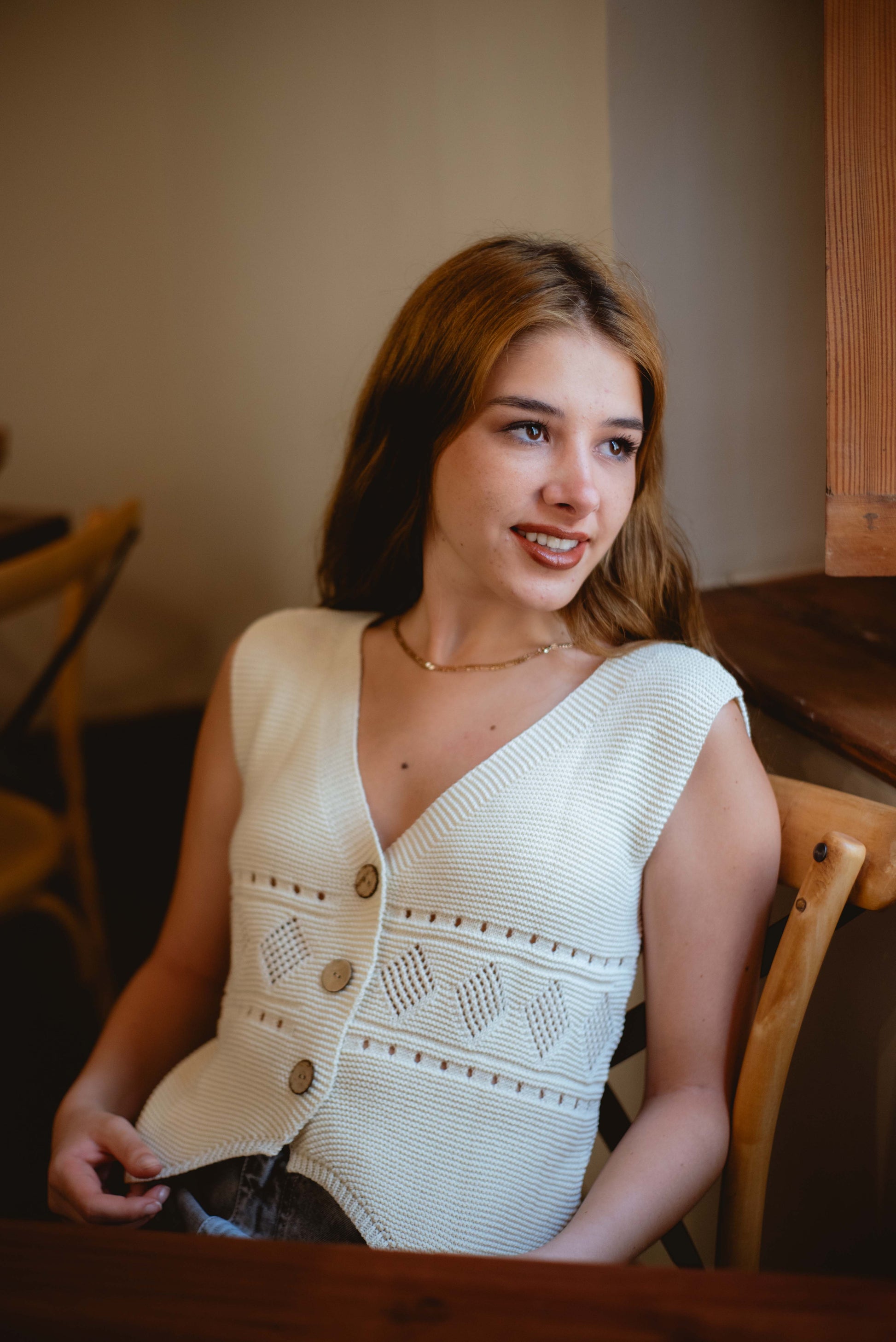 Chaleco en hilo 100% algodón, ideal para un look fresco y relajado. Su diseño ligero y versátil lo convierte en la prenda perfecta para cualquier ocasión. 🌿💫