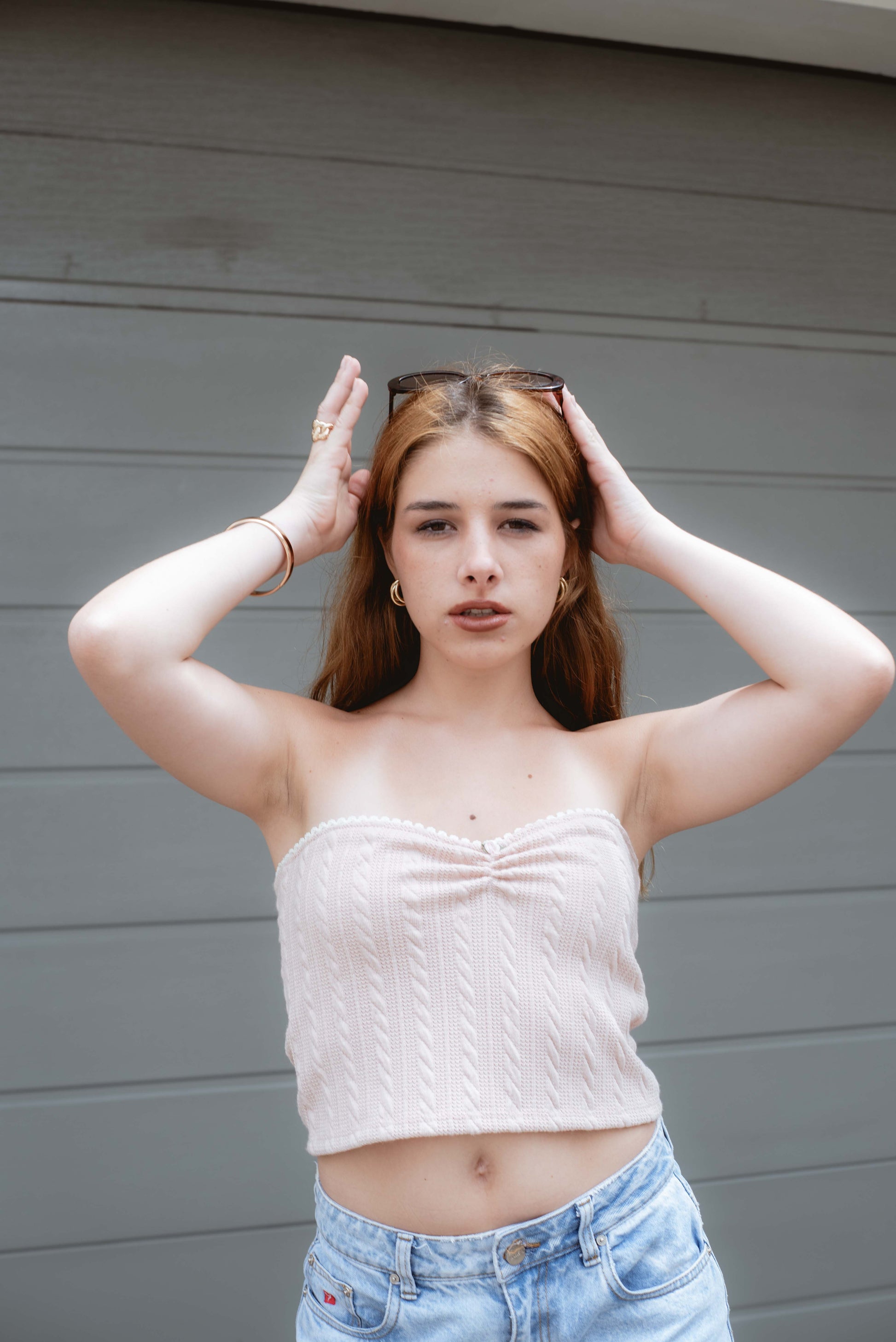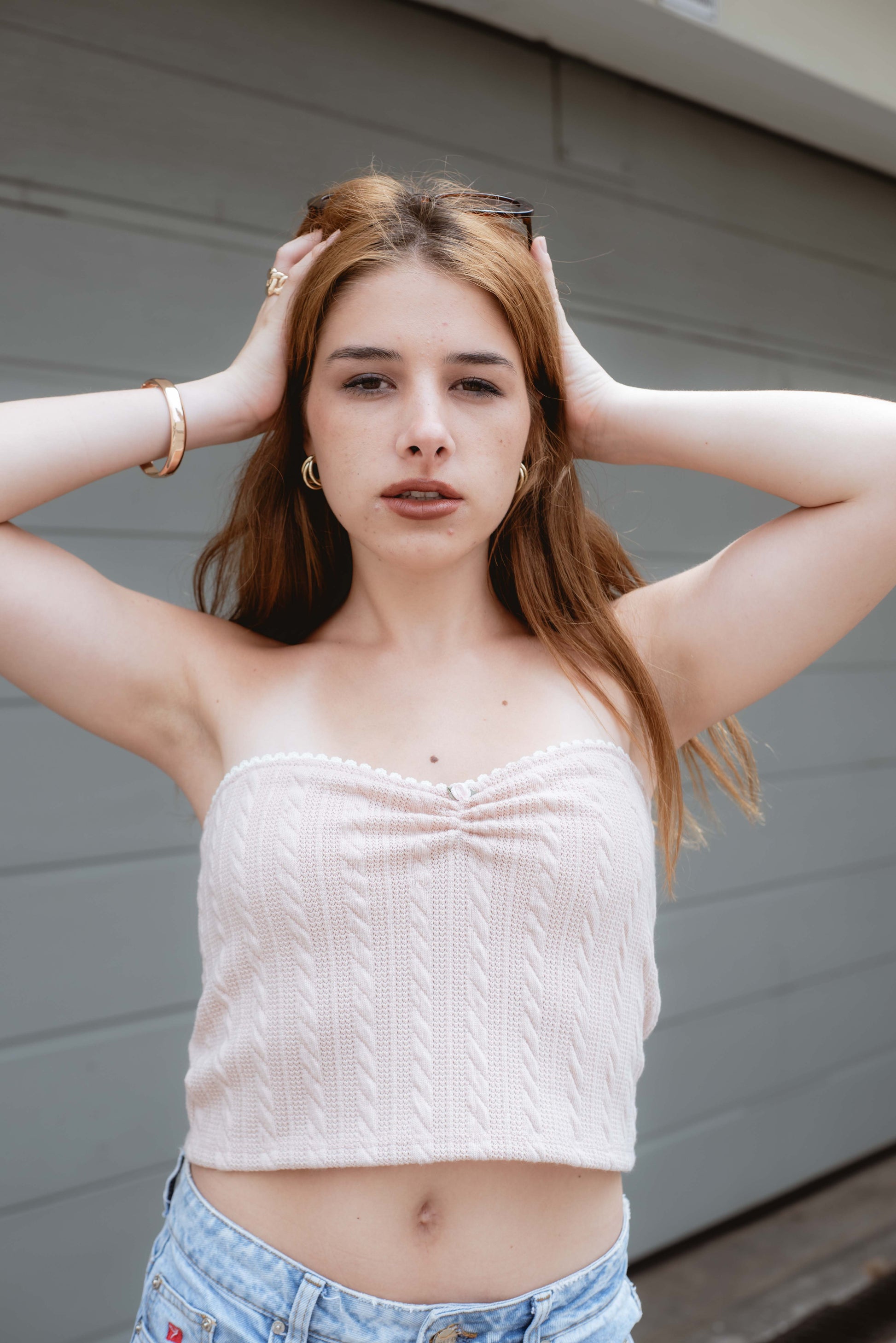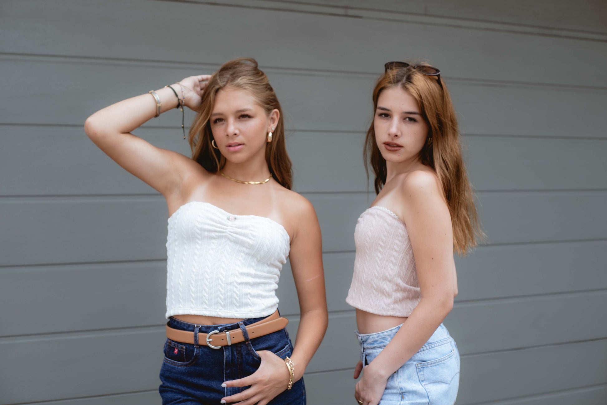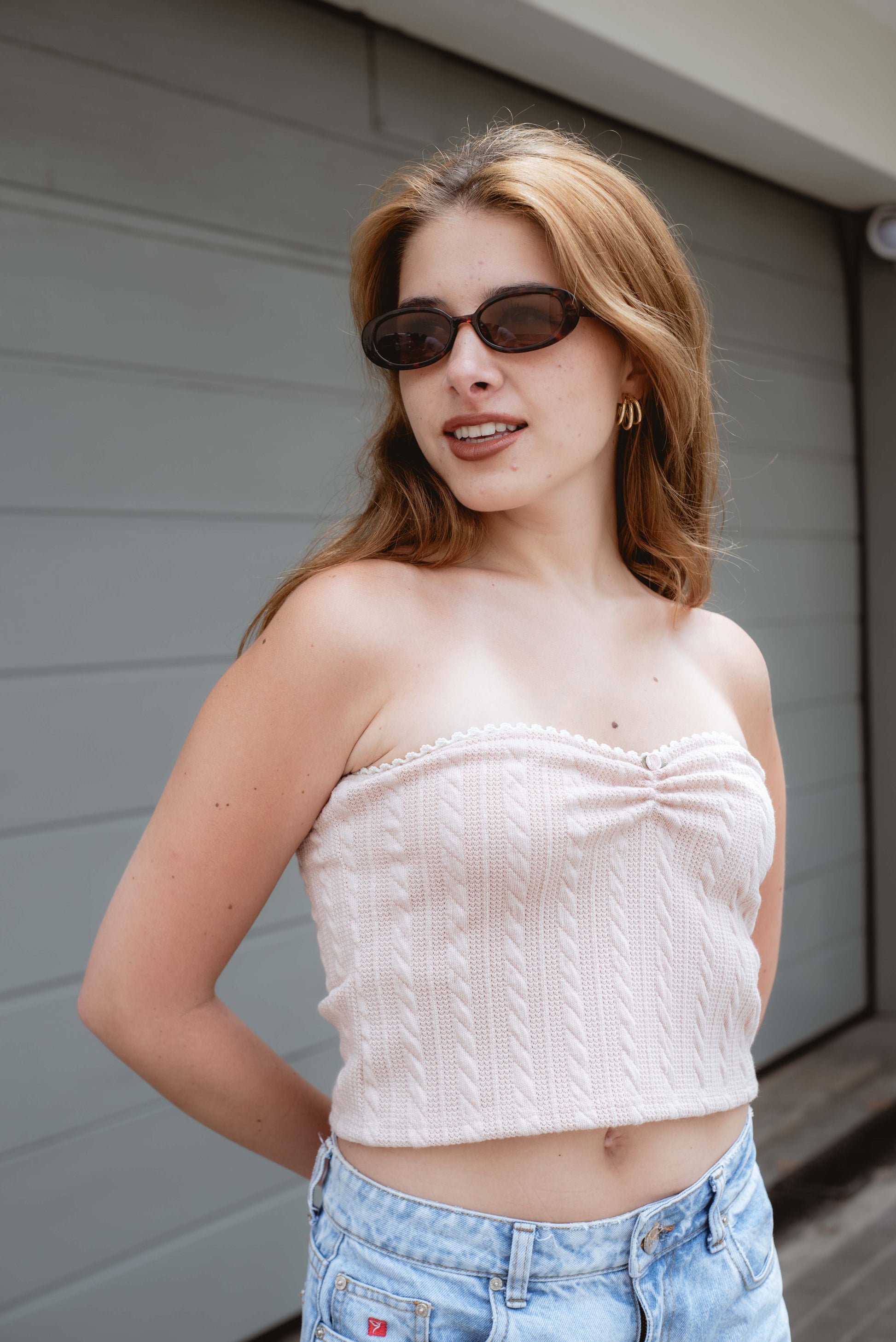 Top corto sin tiras, con un delicado diseño de flor en el centro.